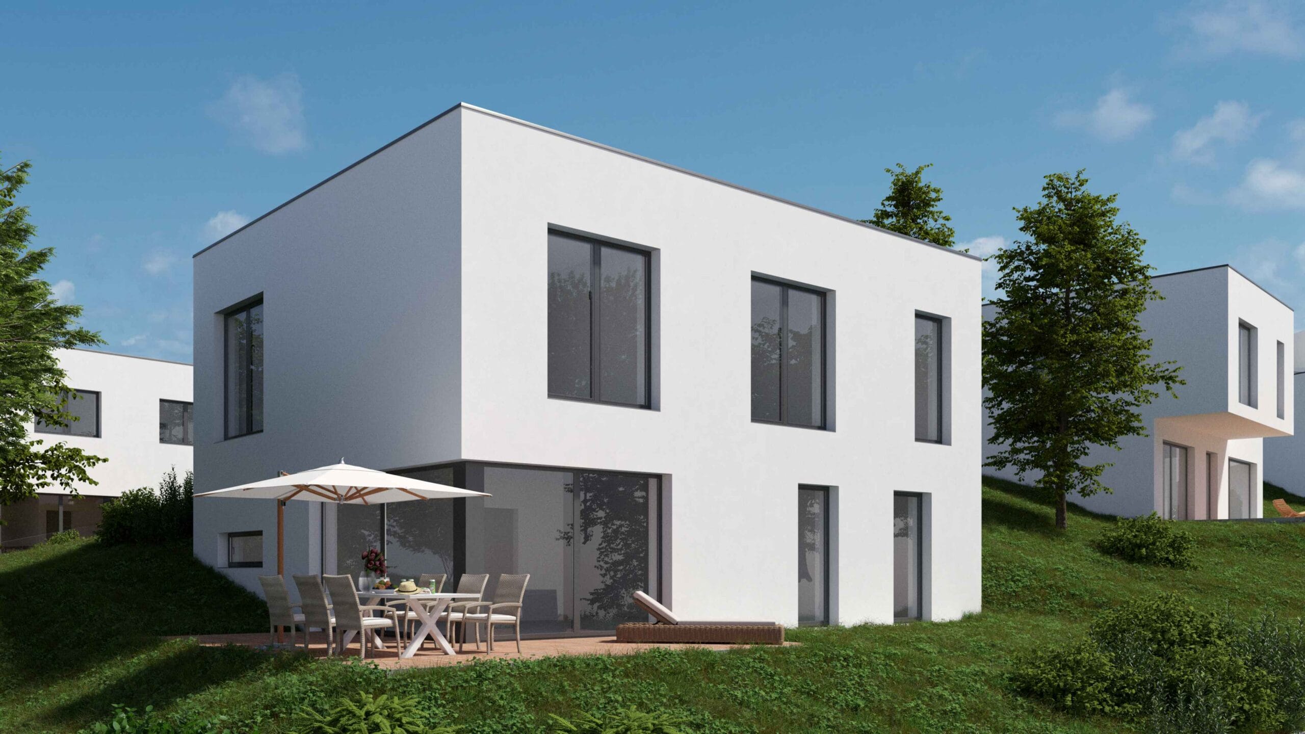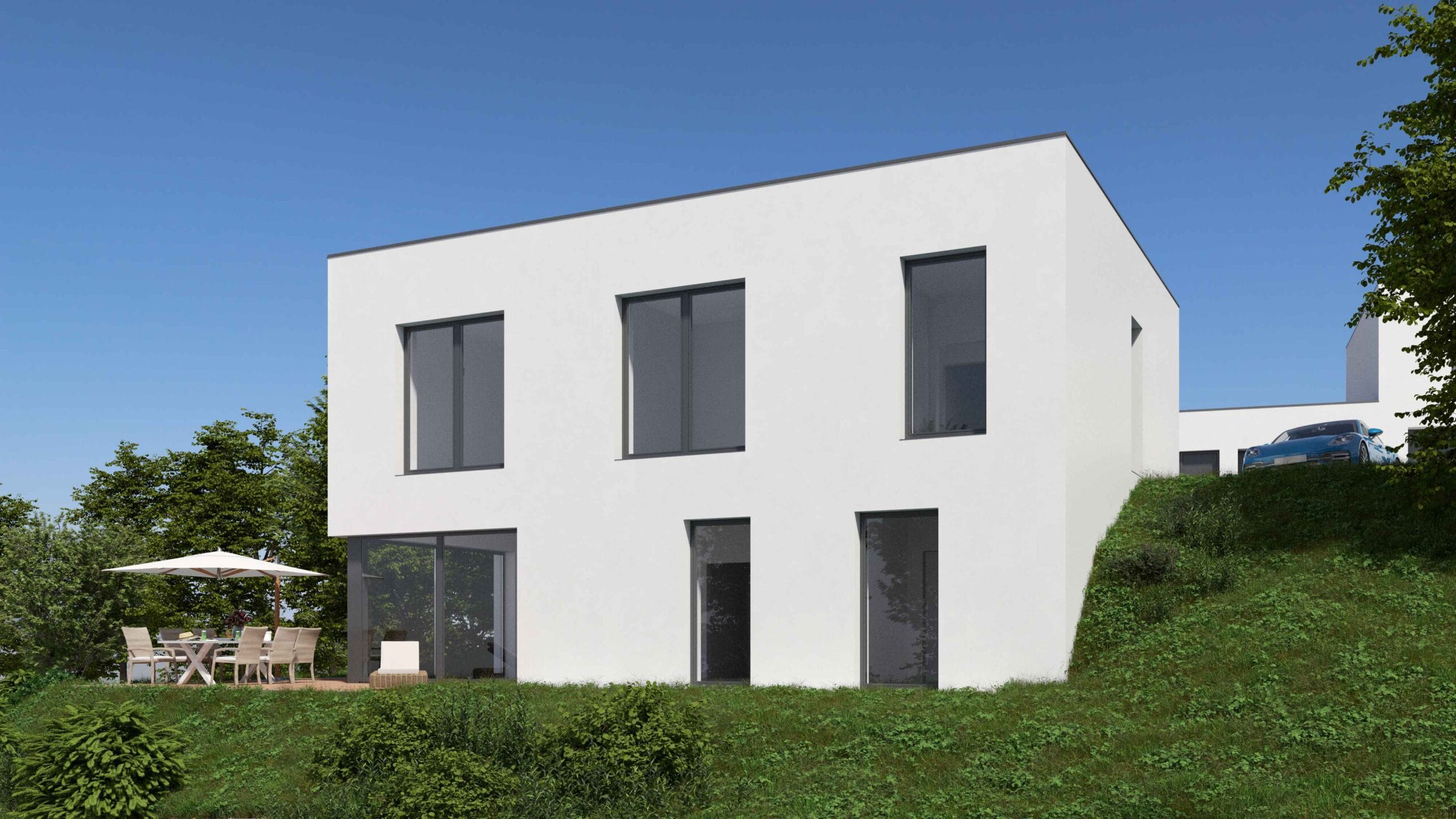 Na pozemku je navržen moderní rodinný dům se dvěma podlažími a plochou střechou.